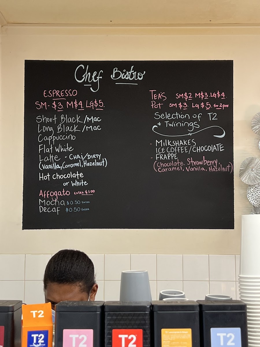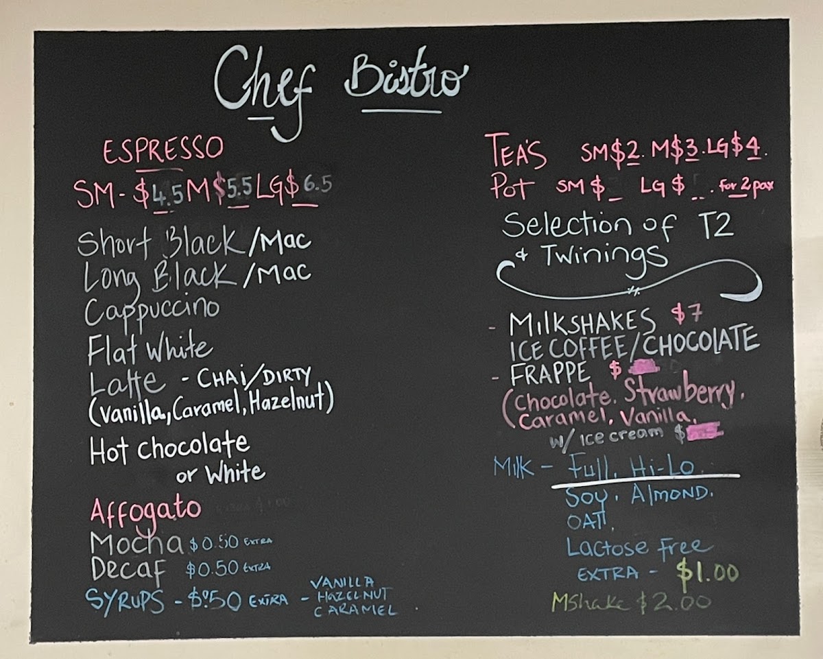 The menu at Chef Bistro - North Regional TAFE Pundulmurra Campus offers a variety of options suitable for breakfast, coffee breaks, and light meals. It is designed to cater to casual dining with choices for both quick orders and more leisurely visits.